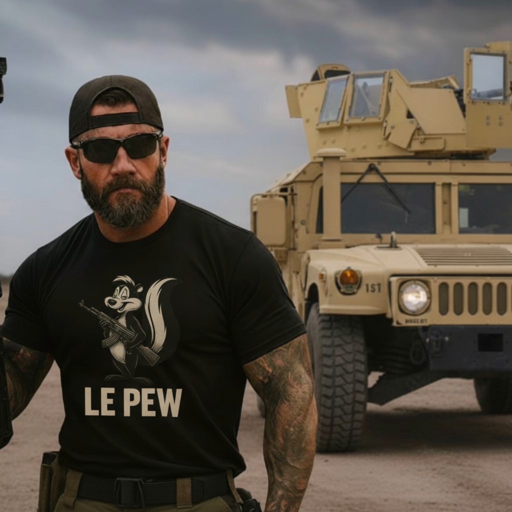 Le Pew Tee | Funny AK Skunk Shirt for Gun Owners & Degenerates with Dark Humor - BACK PRINT