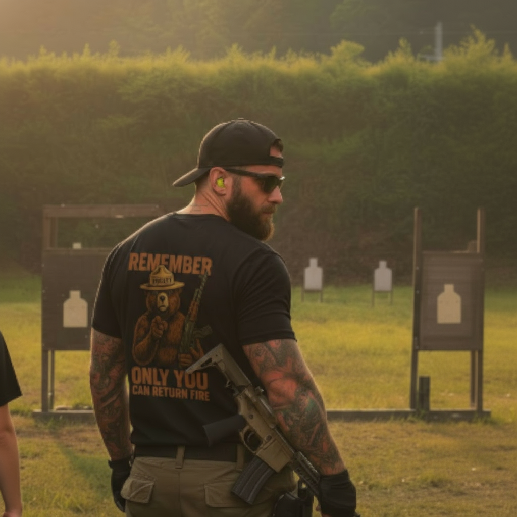 Smokey Bear Parody Shirt – Only You Can Return Fire – AK-47 Funny Tactical Graphic Tee - FRONT PRINT