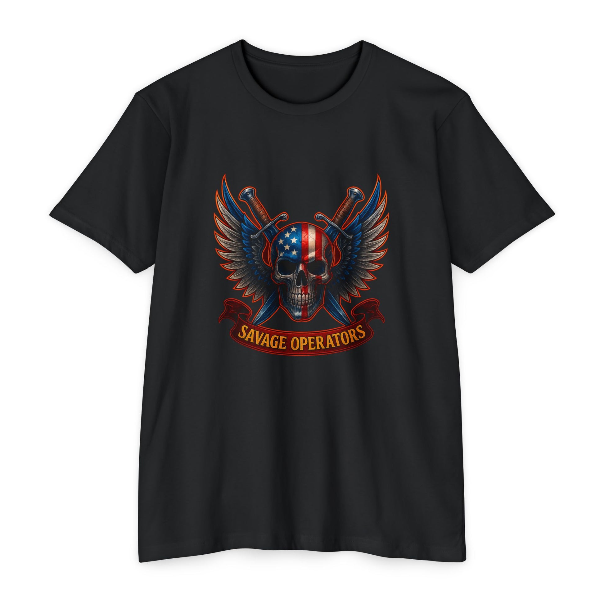 This design hits hard with a winged skull painted in the American flag, crossed blades behind, and a banner screaming Savage Operators.