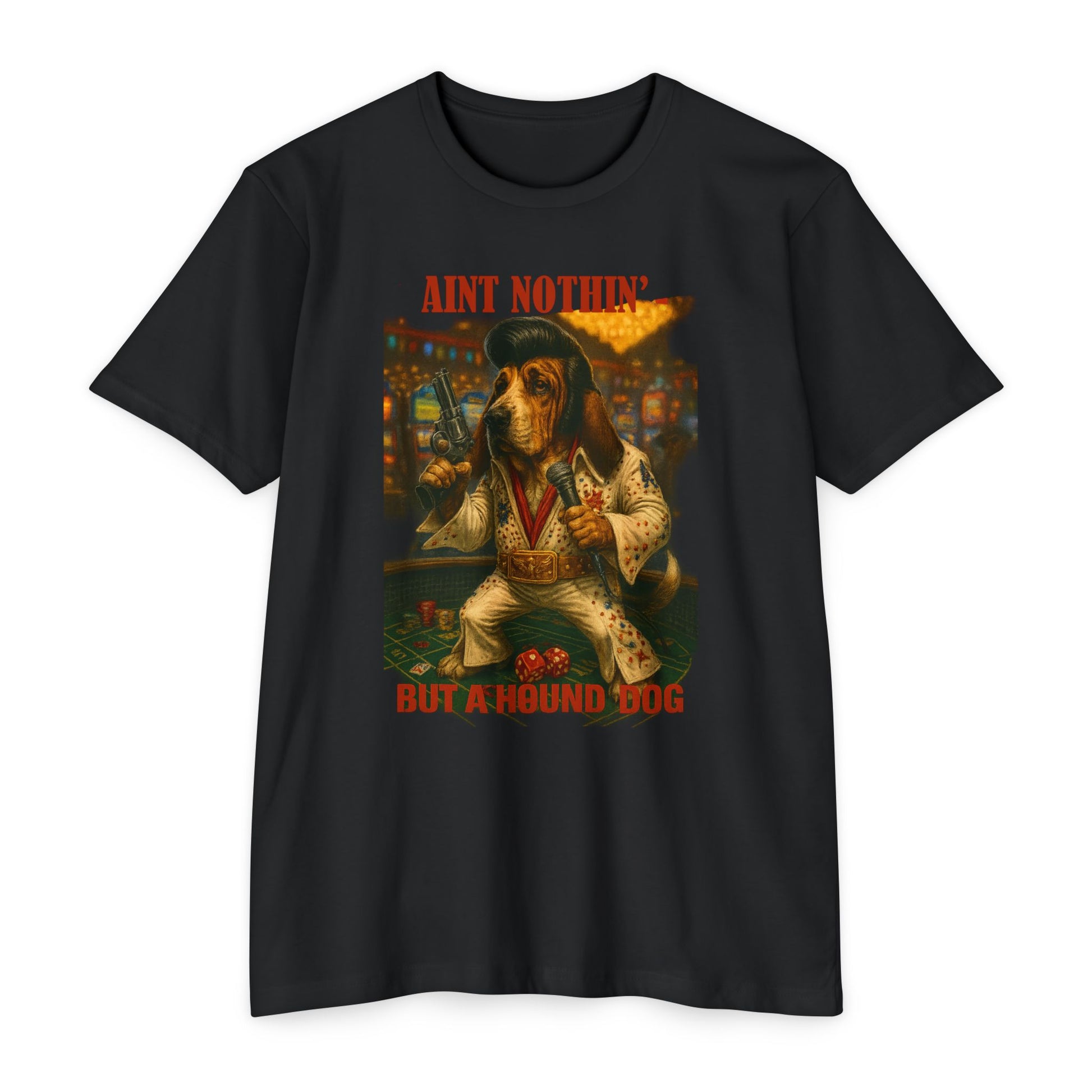 This Vegas-ready basset hound is all shook up and locked in for a show you’ll never forget. Dressed to kill (literally), our Elvis parody graphic tee brings rock ‘n roll energy with just the right amount of ridiculous.